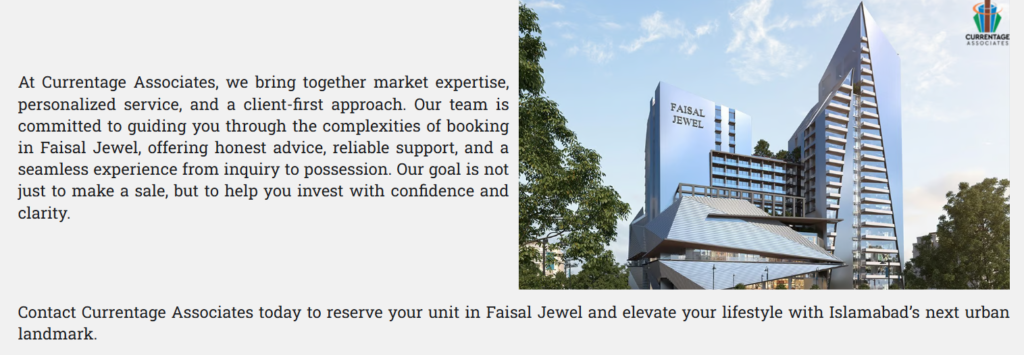 Currentage Associates plays a pivotal role in guiding buyers and investors through the process of securing property in Faisal Jewel. As a reputable real estate consultancy, they offer: